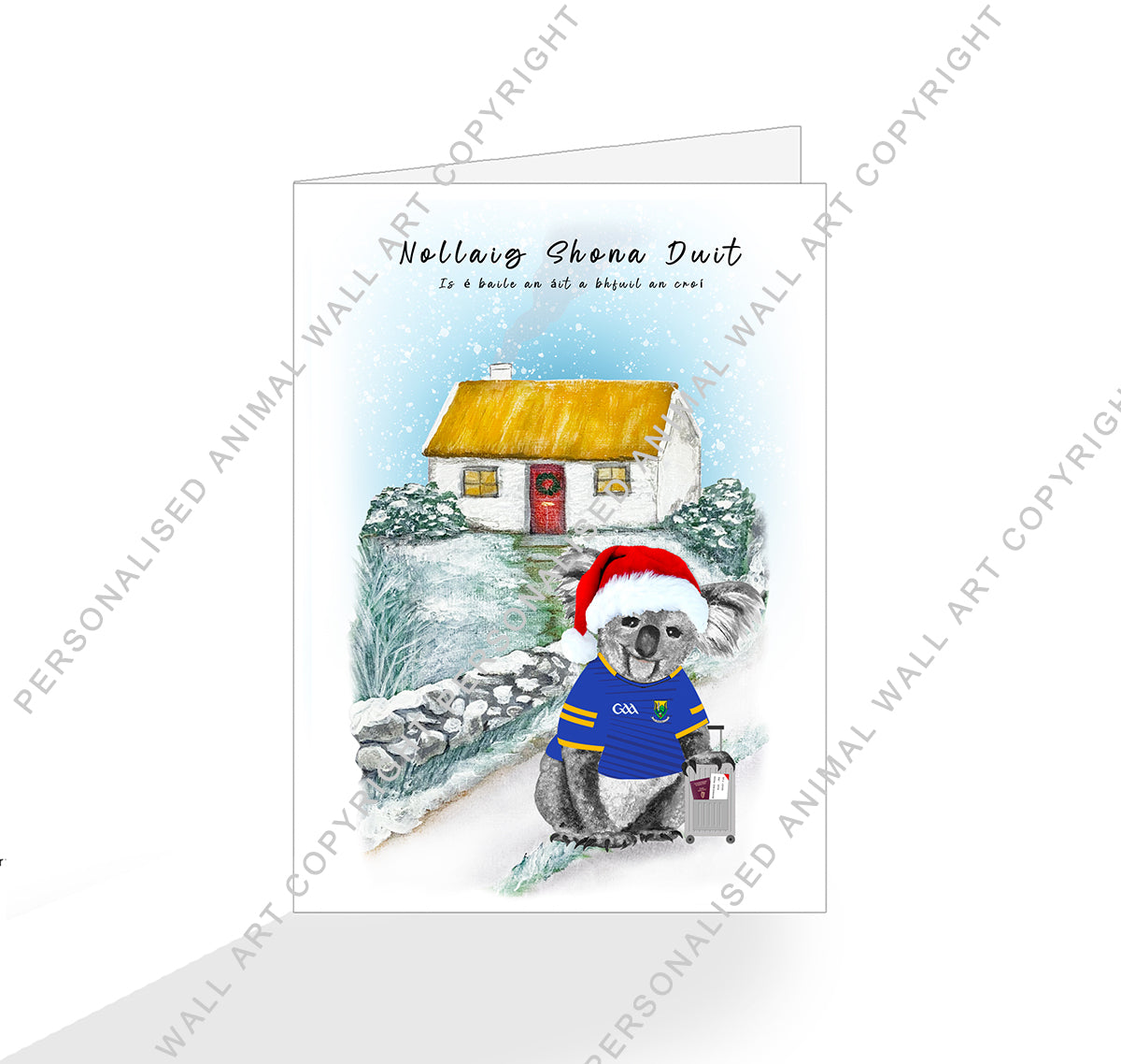 Cute koala with suitcase, wearing county jersey and Santa hat. Personalise jersey to your county/Irish jersey.